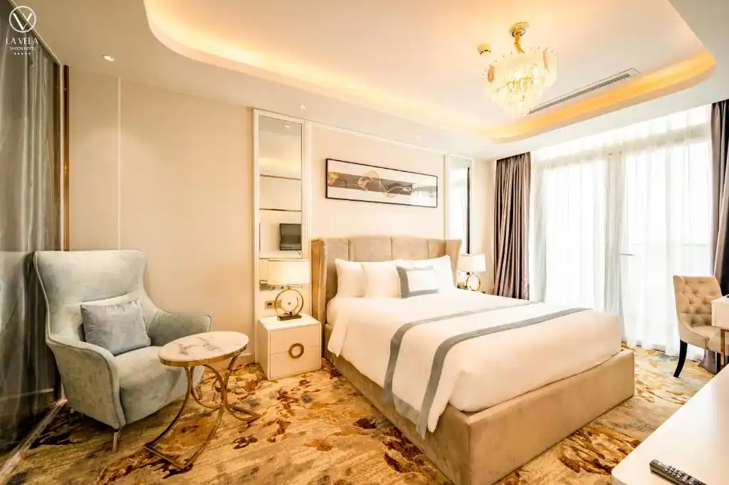 Hébergement Élégant: L’établissement La Vela Saigon Hotel à Ho Chi Minh-Ville propose une expérience 5 étoiles avec une piscine sur le toit, un centre de fitness, une terrasse ensoleillée, un restaurant, un bar et le Wi-Fi gratuit. Équipements Confortables: Vous apprécierez la climatisation, les balcons avec vue sur la ville, les salles de bains privatives, les minibars et les articles de toilette gratuits. Les installations supplémentaires incluent un salon, un bain public, un hammam, des forfaits bien-être et un casino. Options de Restauration: L'hôtel sert une cuisine asiatique avec des petits-déjeuners continentaux, américains et sous forme de buffet. Des options sans produits laitiers sont disponibles, accompagnées de musique live et d'espaces extérieurs. Emplacement Idéal: Situé à 5 km de l'aéroport international de Tan Son Nhat, l'hôtel se trouve à 8 minutes à pied du marché de Tan Dinh et à proximité d'attractions telles que le musée des vestiges de la guerre et le Palais de la Réunification.