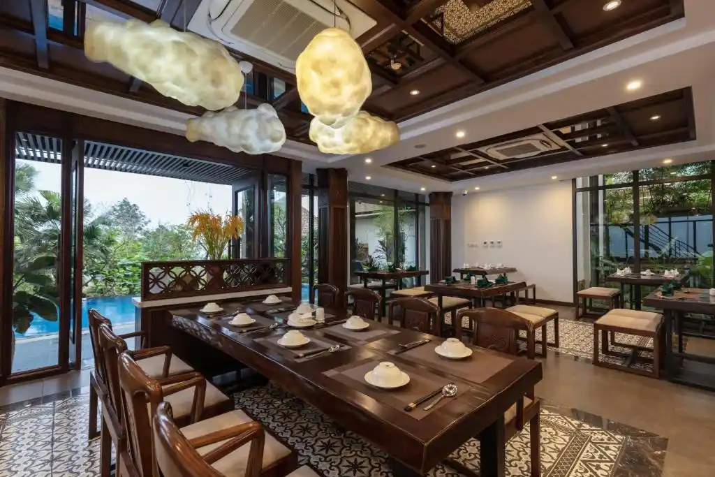 Expérience Culinaire : Le restaurant traditionnel sert des cuisines vietnamienne, asiatique et internationale avec des options végétariennes, sans gluten et sans produits laitiers. Le petit-déjeuner comprend des spécialités locales, des plats chauds, des pâtisseries fraîches et une variété de boissons.